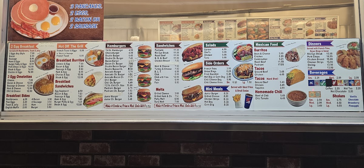 The menu is suitable for breakfast, lunch, and dinner, providing options that range from quick, casual meals to more filling dishes. Visitors typically place orders for takeout or quick service dining, with an emphasis on classic American burger specialties and hearty breakfast items.